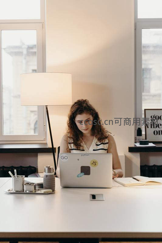 一位卷发女性坐在整洁的白色办公桌前,专注地操作贴满编程贴纸的笔记本电脑,窗外阳光洒入,营造高效工作氛围。