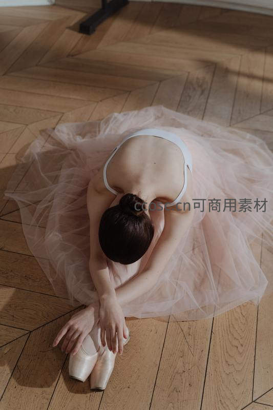 身穿粉色纱裙的芭蕾舞者跪坐于人字拼木地板上,低头整理舞鞋,柔和光线勾勒出疲惫而优美的姿态,充满艺术感。