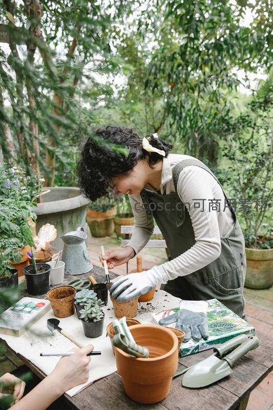 一位穿着围裙的女性园艺师在户外木桌上精心为多肉植物换盆,周围摆放着各种园艺工具和盆栽,背景是郁郁葱葱的绿植。