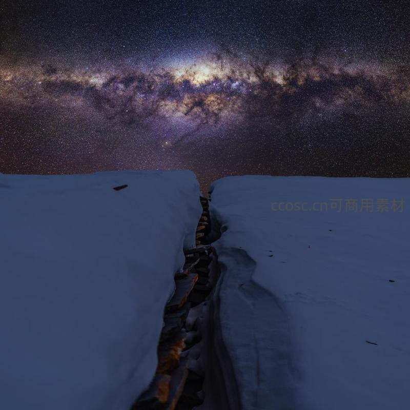 一条被厚雪覆盖的小径蜿蜒向前,尽头是横贯天际、璀璨夺目的银河,雪白与深邃星空形成强烈视觉冲击,充满神秘感。