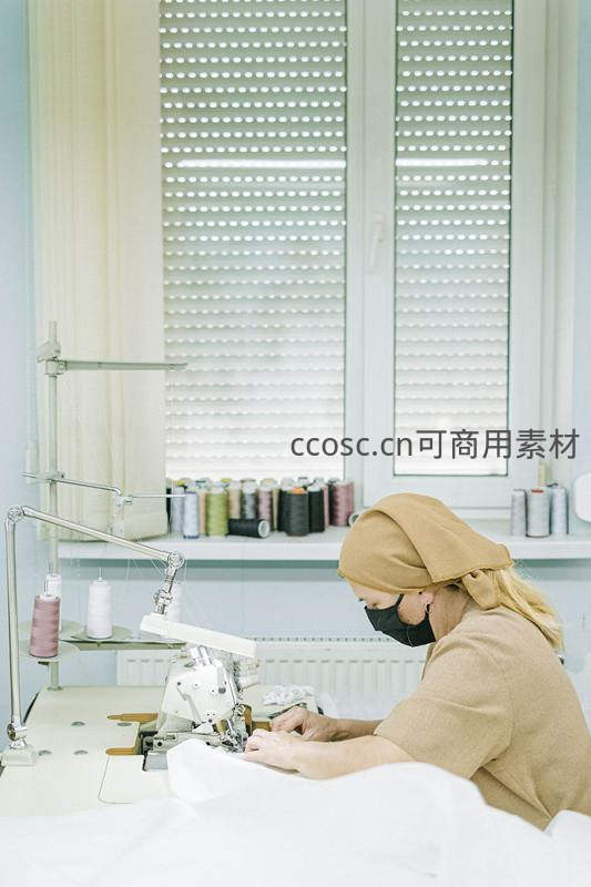 一位戴着口罩和头巾的女工正专注地操作缝纫机,背景是整齐排列的彩色线轴和透光百叶窗,展现手工制作的宁静与专业。