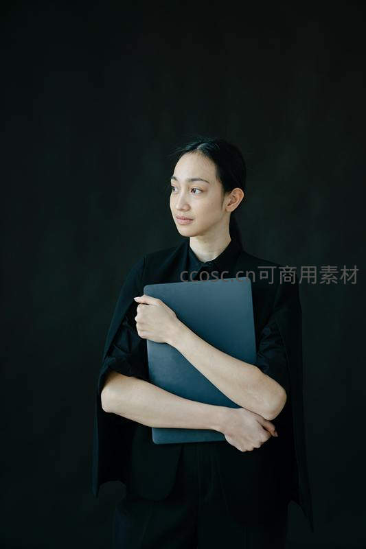 身穿黑色职业装的女性怀抱笔记本电脑,侧身凝望远方,深色背景衬托出她的沉静与思考,传递现代职场人的内敛力量与专业气质。