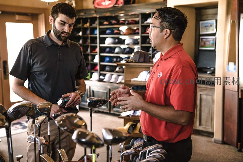 在一家高尔夫用品店内,穿着红色Polo衫的销售顾问正向顾客介绍球杆特性,顾客手持球杆认真聆听。