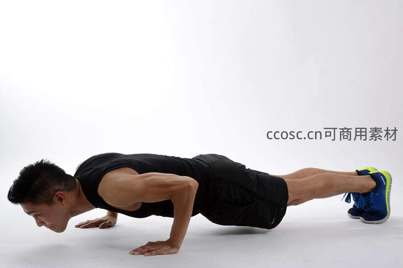 一名肌肉线条分明的男子在纯白背景下进行标准俯卧撑,展示核心肌群发力与身体控制力,体现日常健身的专注与坚持。