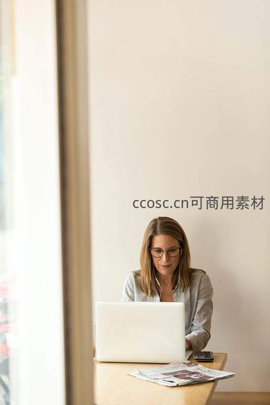 一位戴眼镜的女性坐在木质桌前,专注操作白色笔记本电脑,桌上散落报纸和手机,柔和自然光从窗边洒入,营造安静高效的工作氛围。