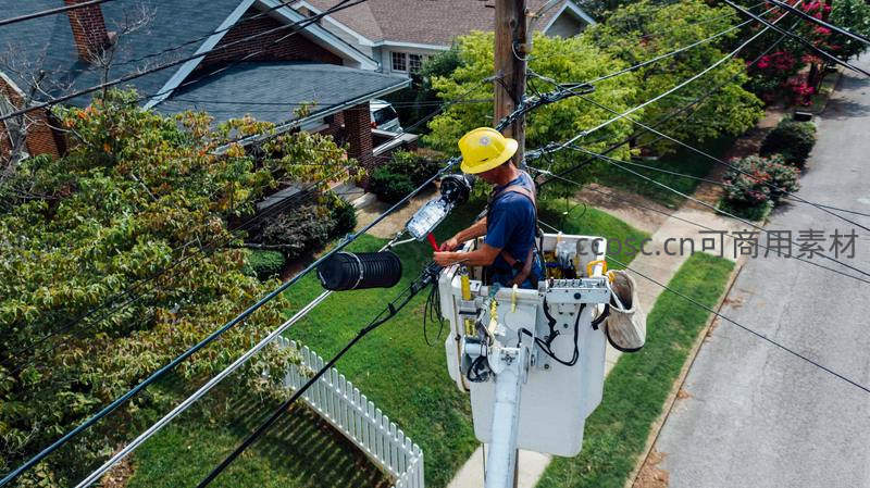 一名身穿工作服、头戴黄色安全帽的电工正站在高空作业车吊篮中,专注地检修居民区上方的电线电缆。
