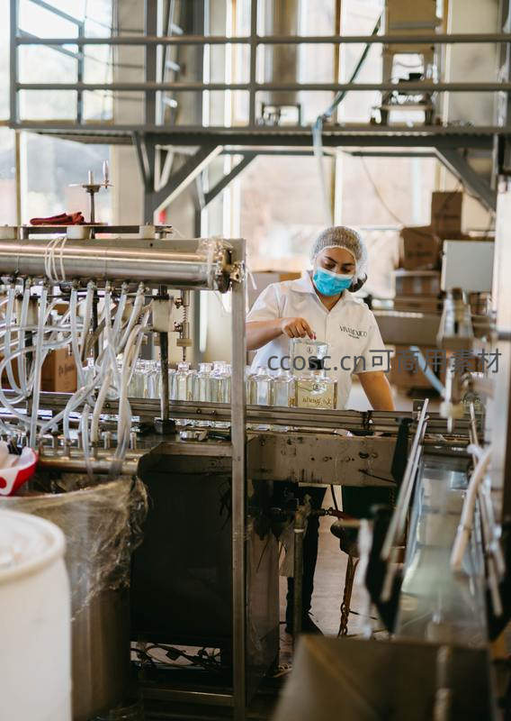 一名戴着口罩和发网的女工在现代化的瓶装生产线上工作,周围是复杂的管道和传送带,体现了工业生产的严谨与高效。