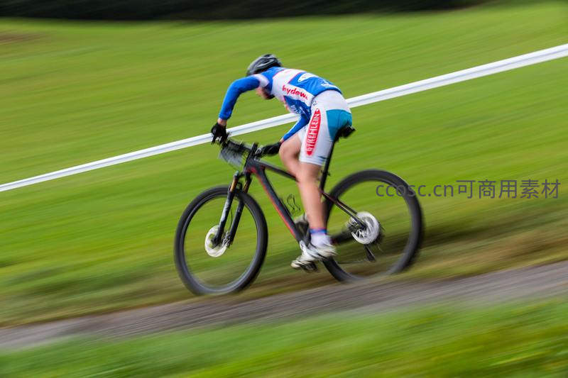 一名身穿专业骑行服的运动员正驾驶山地自行车在草地上高速过弯,背景的动态模糊效果突出了比赛的速度感与竞技激情。