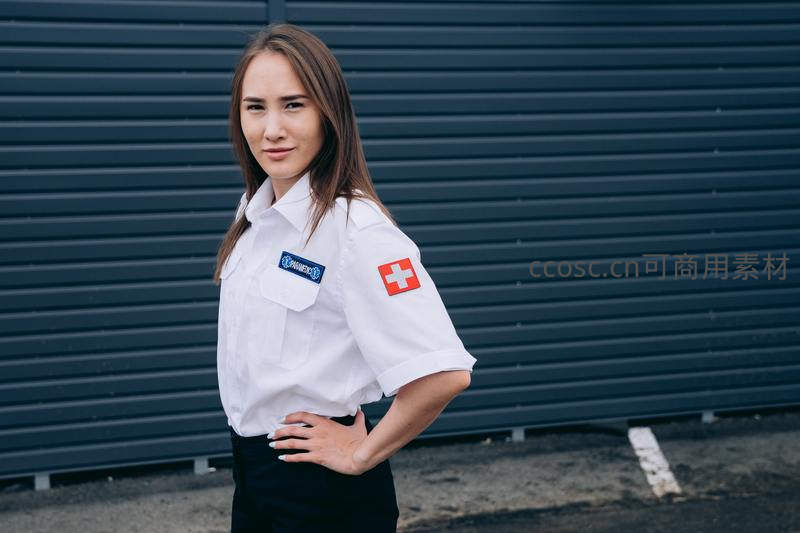 一名穿着白色急救制服、佩戴红十字臂章的女性站在深色金属墙前,双手叉腰微笑,展现医疗工作者的专业与亲和力。