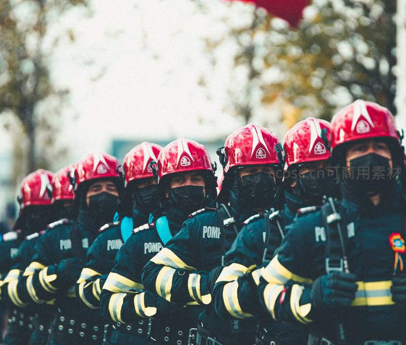 一队身着黑色防火服、佩戴红色头盔和口罩的消防队员整齐列队,神情严肃,肩章与反光条清晰可见,彰显职业纪律与应急救援的庄严使命感。