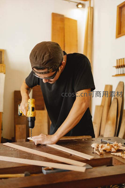 一位戴着护目镜和帽子的木匠正在工作台上使用电钻加工木料,周围散落着刨花和工具,背景是温暖的木质墙面,体现手工艺人的匠心与专注。
