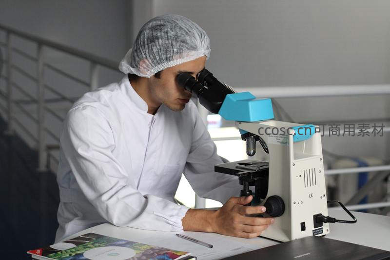 身穿白大褂、头戴发网的科研人员正俯身通过显微镜进行精密观察,桌上摆放着资料和笔,营造出严谨的科学研究氛围。