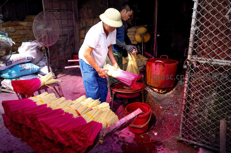 一位老工匠在简陋作坊内将成捆的香条浸入红色染料中,周围堆满成品香束,展现传统香品制作的生动场景。