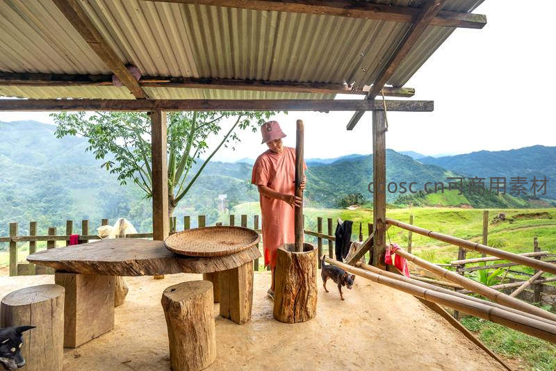 一位农妇站在乡间木屋露台上,手持工具,身后是连绵起伏的绿色山峦和梯田,小狗相伴,构成一幅宁静祥和的田园生活画卷。