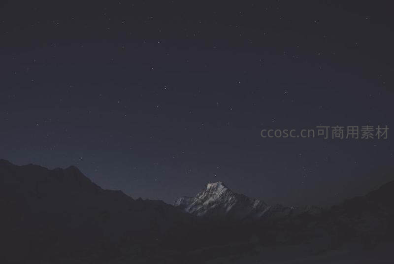 巍峨雪山在深邃夜空下静默矗立,点点繁星如钻石般洒落,营造出一种远离尘嚣的纯净与安宁。