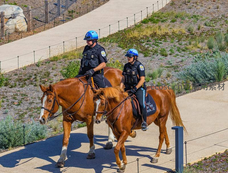 两名佩戴蓝色头盔的骑警骑着棕色骏马,在城市公园步道上并肩巡逻,背景绿植环绕,展现治安与自然和谐共存。