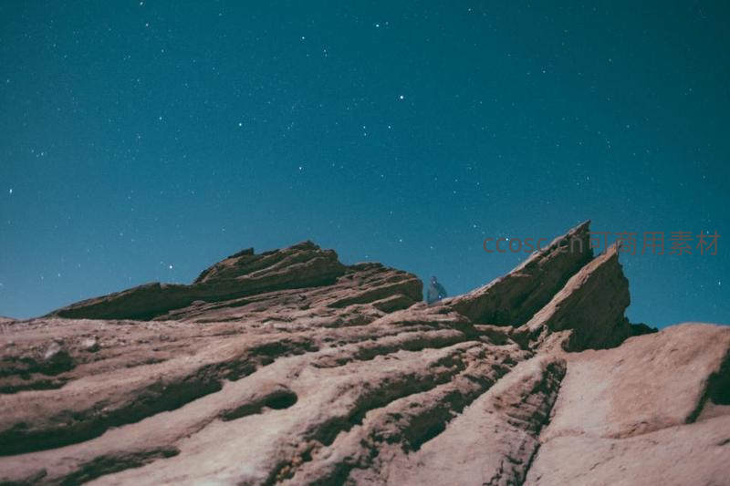 嶙峋的岩石地貌延伸至天际,一人独坐其上,凝视着头顶深蓝苍穹中闪烁的无数星辰,充满探索感。