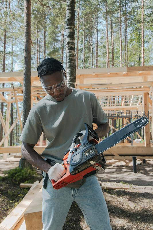 一名工人在阳光明媚的林间工地上专注地操作电锯,背景是正在搭建的木质框架结构,体现了现代木结构建筑的现场施工场景。