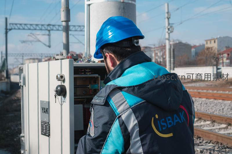 一名佩戴蓝色安全帽的工程师正在铁轨旁检修电气控制柜,背景是清晰的铁路架空线和远处的城镇建筑。
