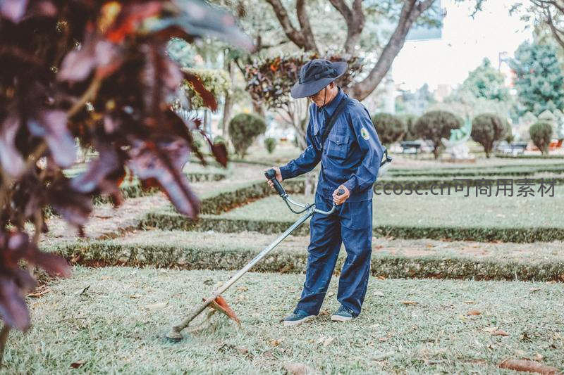 一位身穿蓝色工装的园丁正在公园里用割草机修剪草坪,背景是整齐的灌木和树木,展现了城市绿化的日常维护场景。