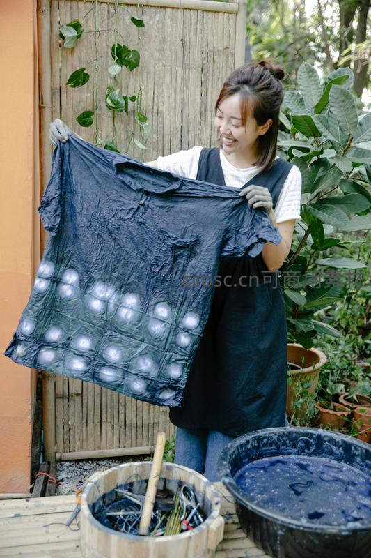女子展示手工扎染布料笑容满面