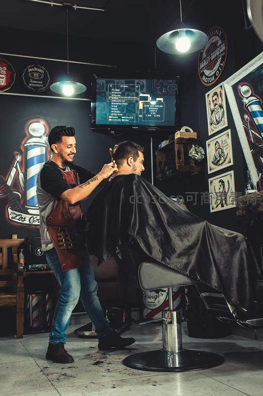 一位专业理发师正在为坐在椅子上的顾客修剪头发,店内装饰复古,氛围轻松愉悦,展现了现代理发服务的细致与专业。