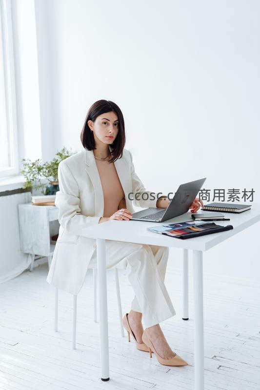 一位穿着白色西装的女性在明亮的办公室内使用笔记本电脑工作,桌上摆放着文件和文具,整体环境整洁简约,体现高效专业的职场氛围。