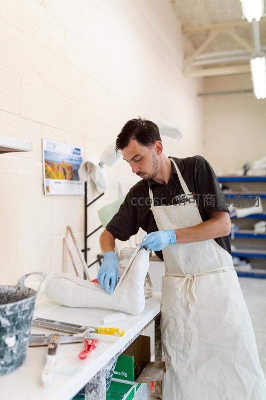 一名工匠身穿围裙,在工作台前专注地处理一件大型石膏作品,周围摆放着各种工具,体现了传统手工艺的精湛与耐心。