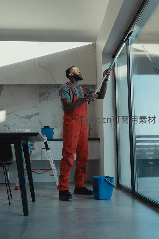 一名身穿红色工装的清洁工人正专注地使用长柄刷清洗高层建筑内的落地玻璃窗,周围环境整洁现代,体现专业服务精神。