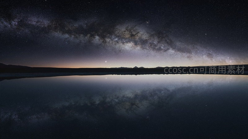 平静湖面完美倒映着横跨天际的银河,天地合一,水天相接,创造出令人屏息的对称美感与宇宙的深邃感。