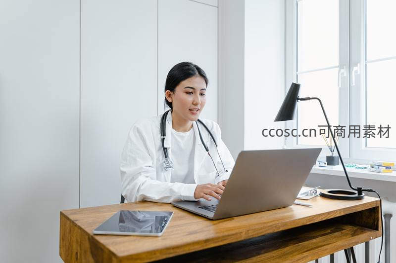 一位身穿白大褂、佩戴听诊器的女医生坐在木质办公桌前,专注地操作着笔记本电脑,环境整洁明亮,窗边摆放着绿植和文具。