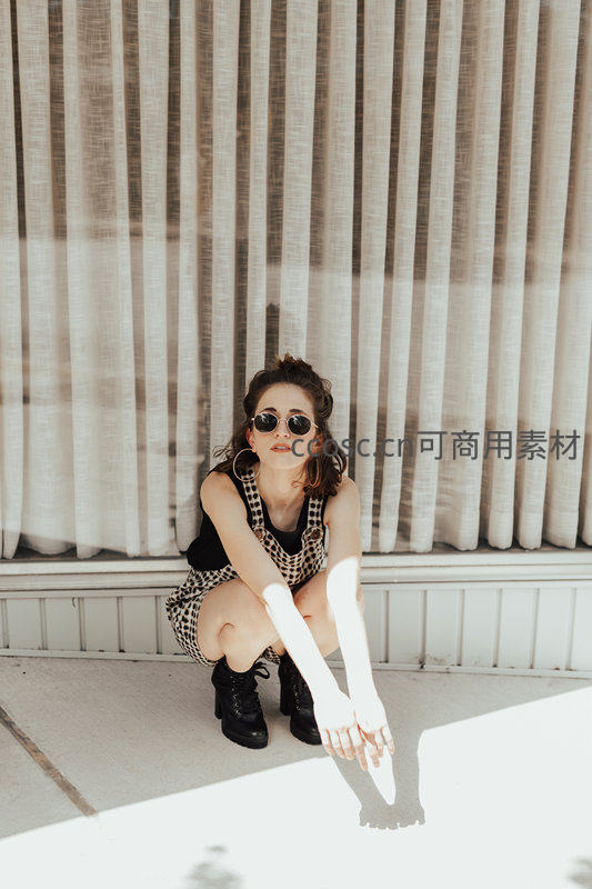 女孩穿着豹纹背带裙和白色长筒袜,在阳光洒落的窗边蹲坐,搭配圆形墨镜,整体造型复古而俏皮,充满生活化的时尚感。