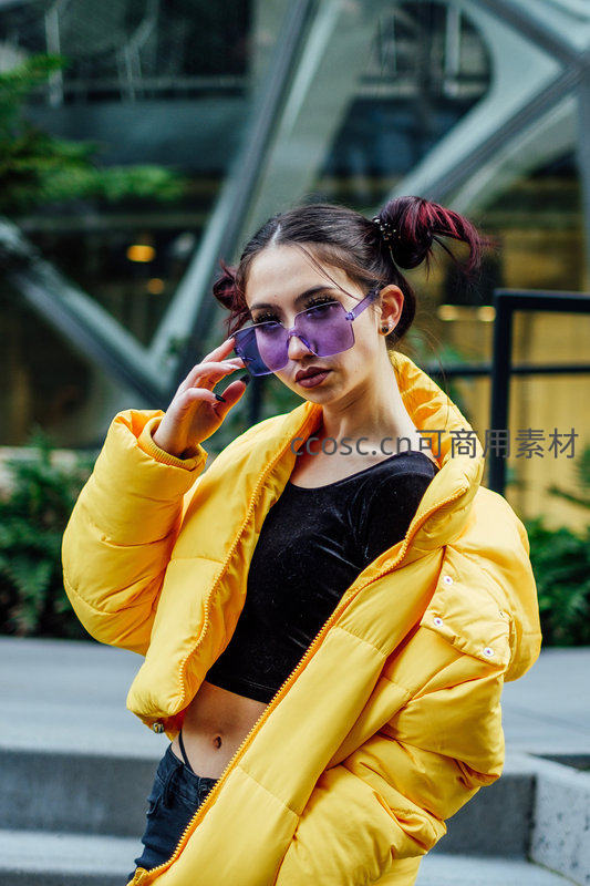 年轻女子身着亮黄色羽绒服和紫色墨镜,在现代都市建筑前摆出酷炫姿势,展现了充满活力与个性的街头时尚风格。