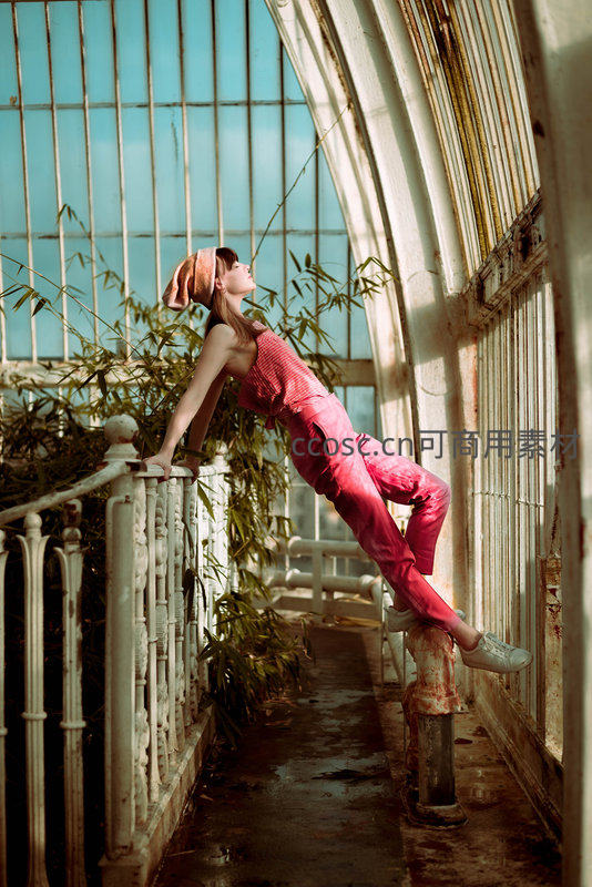 身穿粉色连体裤的女子在充满复古气息的玻璃温室长廊中,以优美的姿态倚靠栏杆,阳光透过玻璃洒下,构成一幅动静结合的艺术画面。