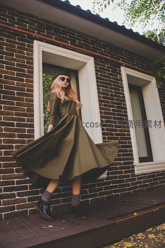 一位粉色长发的女性站在红砖墙前,身着橄榄绿连衣裙,裙摆随风扬起,脚穿黑色短靴,搭配墨镜,展现出自由洒脱的秋日风情。
