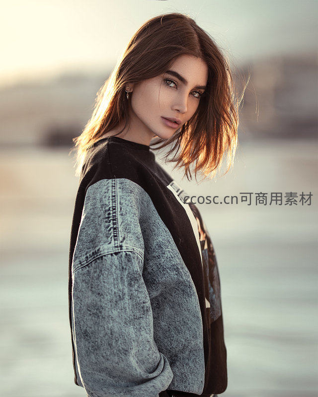 一位年轻女性在柔和的夕阳光线下侧身回眸,身穿黑灰拼接牛仔夹克,发丝微扬,眼神温柔而坚定,充满青春气息。
