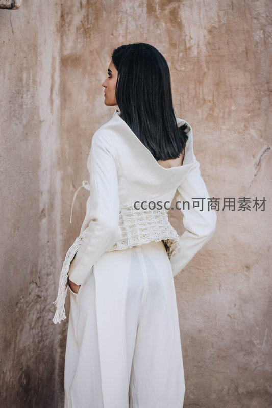 一位黑发女性背对镜头,身穿白色高腰套装,腰间饰有编织细节,倚靠在质朴土墙前,展现极简主义美学与独特设计感。