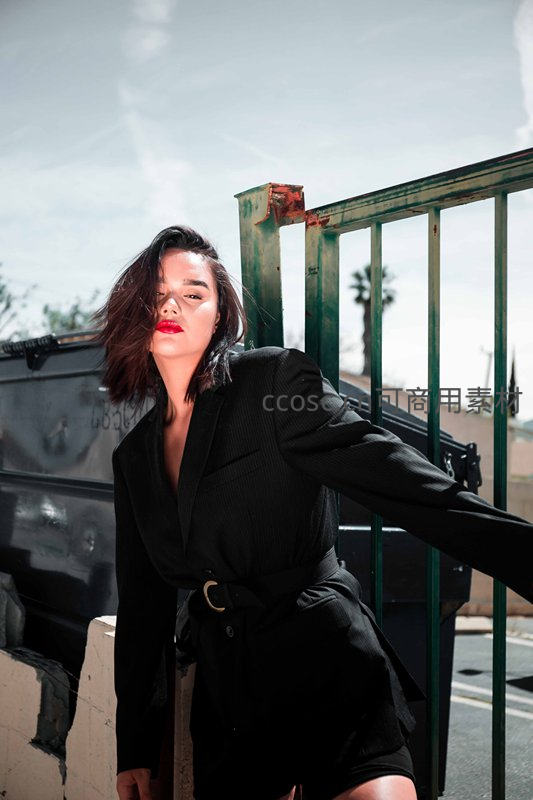 阳光下,一位身穿黑色西装、涂着红唇的女性站在绿锈铁栅栏旁,微风吹动发丝,尽显酷飒与自信。