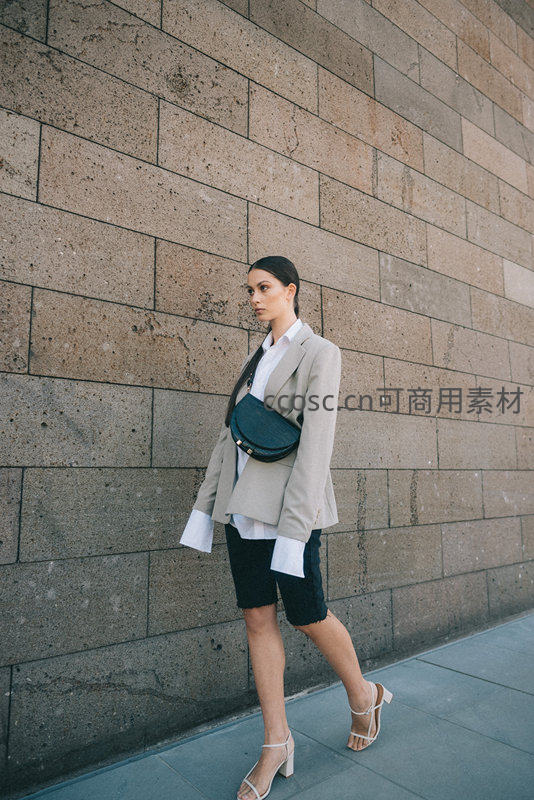 女性身着浅灰西装外套搭配黑色短裤和腰包,脚踩高跟凉鞋,在石墙背景前行走,尽显职场干练与时尚感。