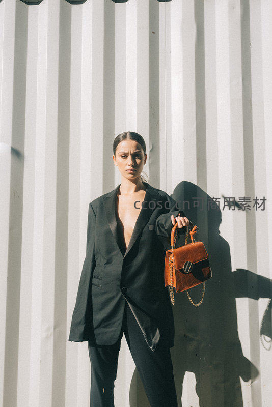 一位身着黑色西装的女性在竖条纹墙前摆拍,阳光投下强烈阴影,她手持棕色链条包,展现现代都市的时尚感与力量。