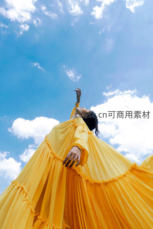 一位身穿明黄色长裙的女子在晴朗的蓝天下仰头伸展手臂,裙摆随风飘扬,展现出自由、浪漫与对自然的热爱。