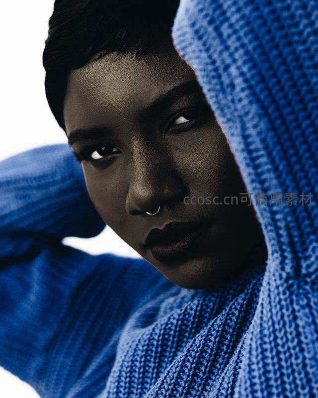 一张充满质感的面部特写,黑皮肤女性穿着蓝色针织衫,眼神深邃,鼻环点缀,背景纯净,强调服装纹理与人物情绪的细腻表达。