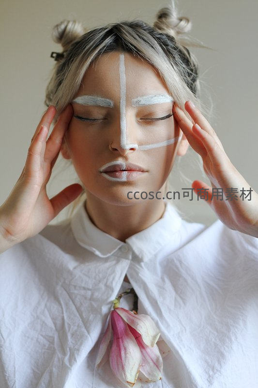 一位金发女子闭目静思,脸上绘有白色几何线条妆容,身穿白色衬衫并佩戴粉色花朵,营造出宁静而富有艺术感的氛围。