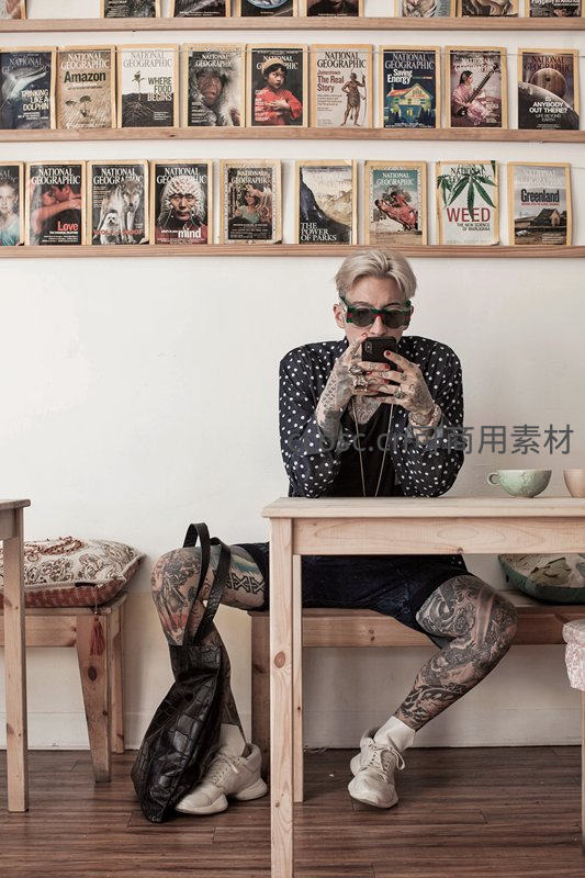 满身纹身的青年坐在木桌前,戴墨镜低头刷手机,背景是整齐排列的国家地理杂志,营造出文艺又潮流的都市休闲氛围。