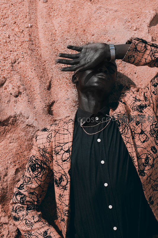 一位黑人模特躺在粉色沙地上,以手遮面,身穿印花外套与黑色衬衫,佩戴精致项链和手表,展现出强烈的视觉冲击力与艺术氛围。