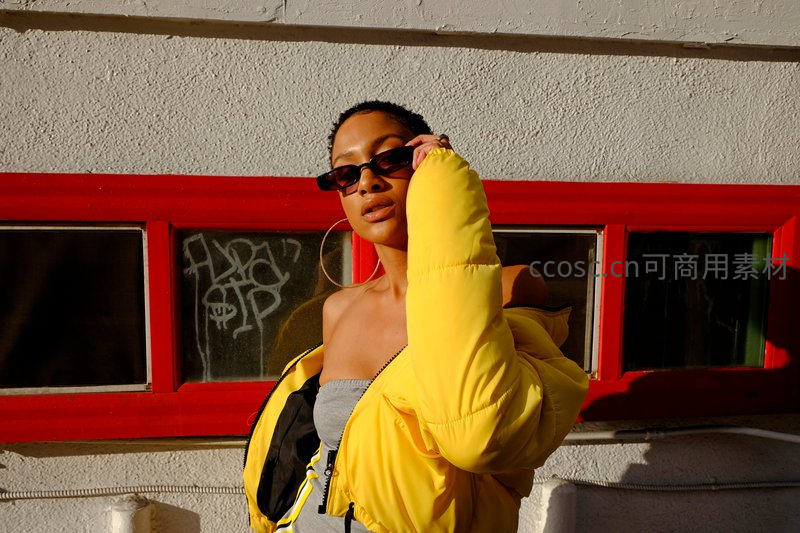 一位年轻女性身着亮黄色羽绒服,在带有涂鸦的红色窗框前摆出时尚造型,阳光洒在脸上,尽显街头潮流魅力。