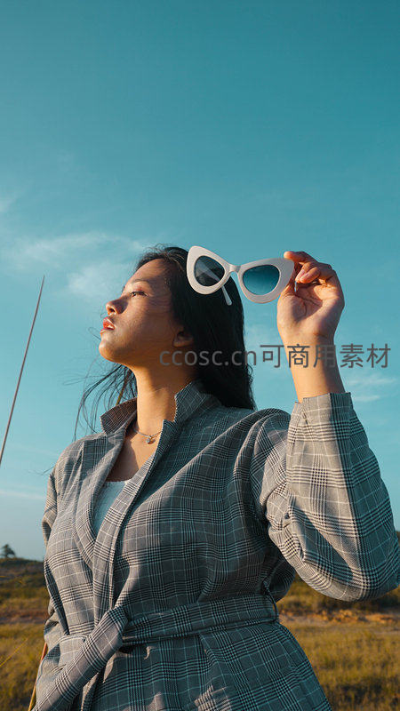女子身穿经典格纹外套,手举白色墨镜仰望湛蓝天空,微风轻拂发丝,展现一种宁静而优雅的户外生活姿态。