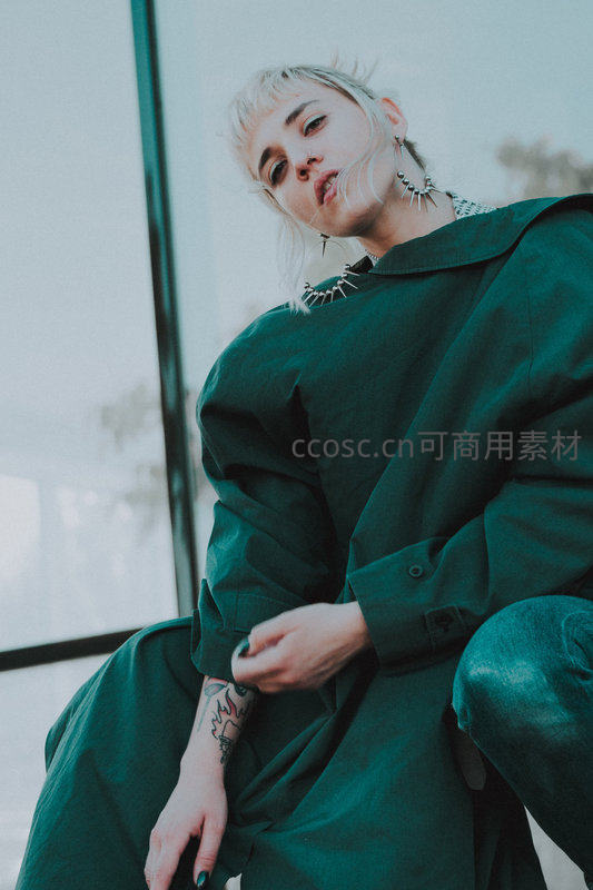 一位拥有银白色短发的年轻女性,身穿宽松墨绿色衬衫,佩戴夸张金属饰品,手臂有彩色纹身,展现前卫街头风格。