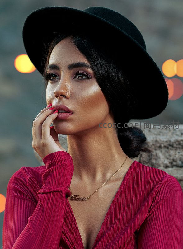 一位戴着黑色宽檐帽、身穿酒红色褶皱上衣的女性,在黄昏暖光下轻触唇边,眼神迷离,散发神秘而优雅的都市魅力。
