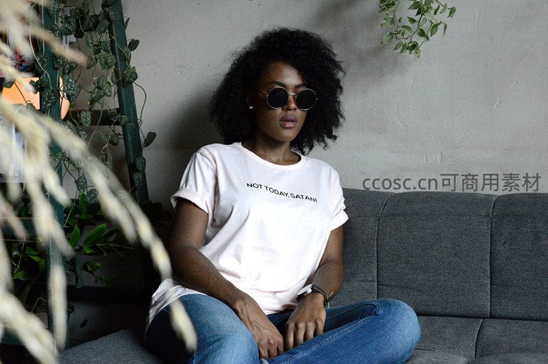 黑人女性坐在灰色沙发上,身穿印有“NOT TODAY SATAN”字样的白色T恤,搭配蓝色牛仔裤和圆形墨镜,周围点缀绿植,营造轻松自在的居家氛围。